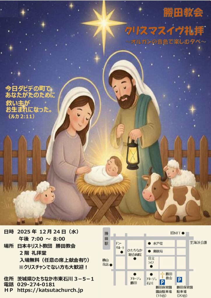 2025年11月19日 / 最終更新日時 : 2025年11月19日 管理人 お知らせ クリスマスイブ礼拝(2025年12月24日(水)) <お問合せ/日本基督教団 勝田教会> 〒312-0052 茨城県ひたちなか市東石川3-5-1 TEL: 029-274-0181